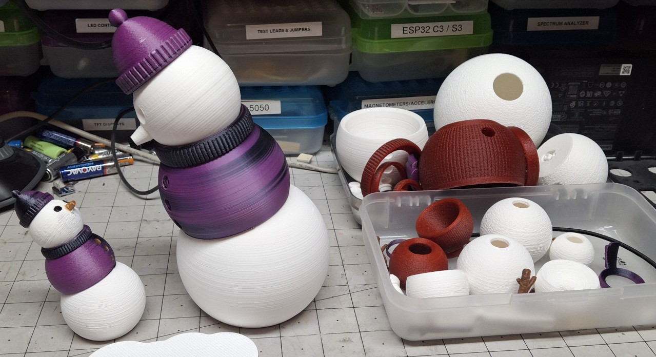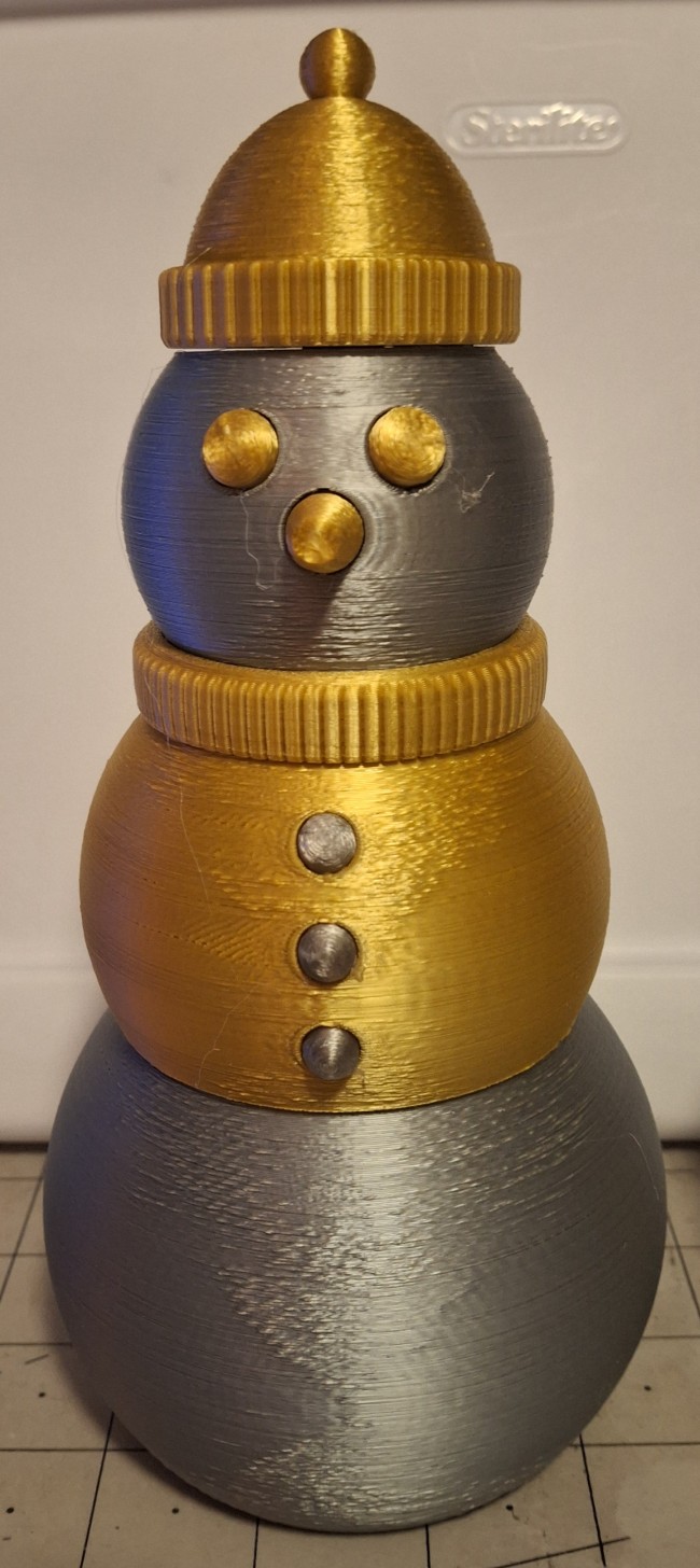 There’s roughly 330 meters (700′) of filament on a spool, so only two giant bottoms could be printed before running out. And that 13 hour estimate is probably 2 hours shy of what it really takes to print one. Each spool weighs 1kg (2.2#), so each giant snowman would weigh 2½ to 3 pounds! You can see why I decided to half size them. I may try printing one someday, but not right now!