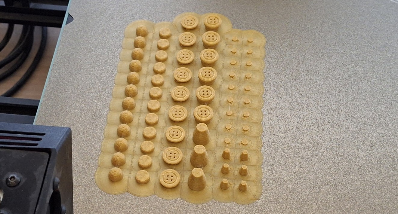 Meanwhile the other printer is cranking out enough of the white parts to match the corresponding colored ones. Between colors, brown is loaded to print a set of arms for the small ones and another set for the large ones. Black or gold is loaded between colors and a set of buttons, eyes, and noses, both large and small, are printed using a brim to contain all those smaller pieces in a single “sheet”.