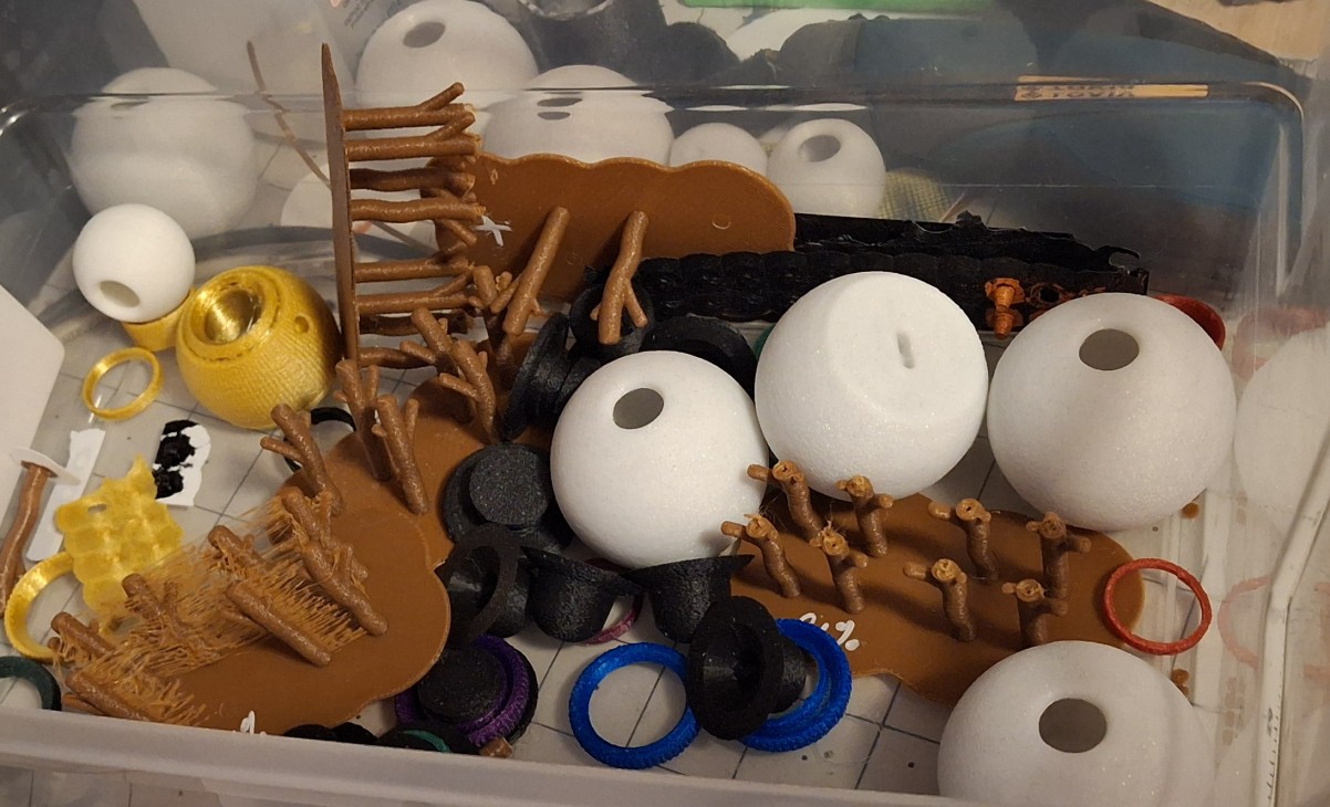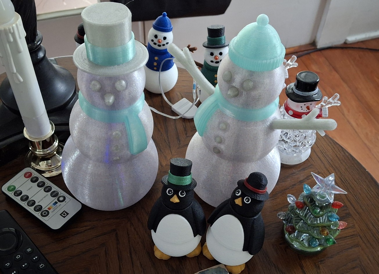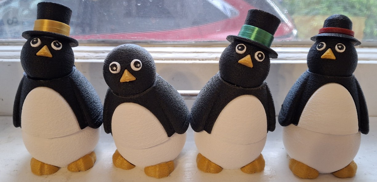You may have noticed the penguins in the picture above. They’re posable like the snowmen. I didn’t print many of them, but enough of them Ann had to tell me we have enough of them. Like the snowmen, it takes some dialing in to get the sizes right. The white part of the chest fits into a black second part, or at least it’s supposed to. It takes a couple tries to get it spot on.