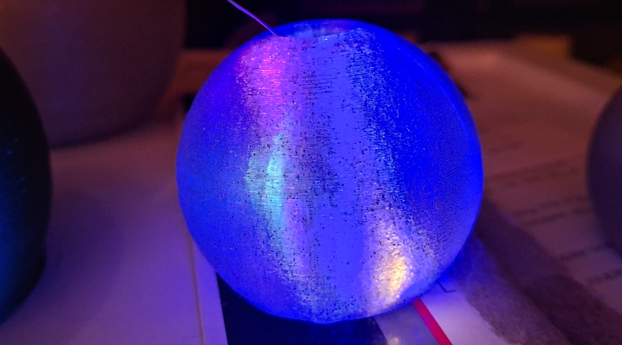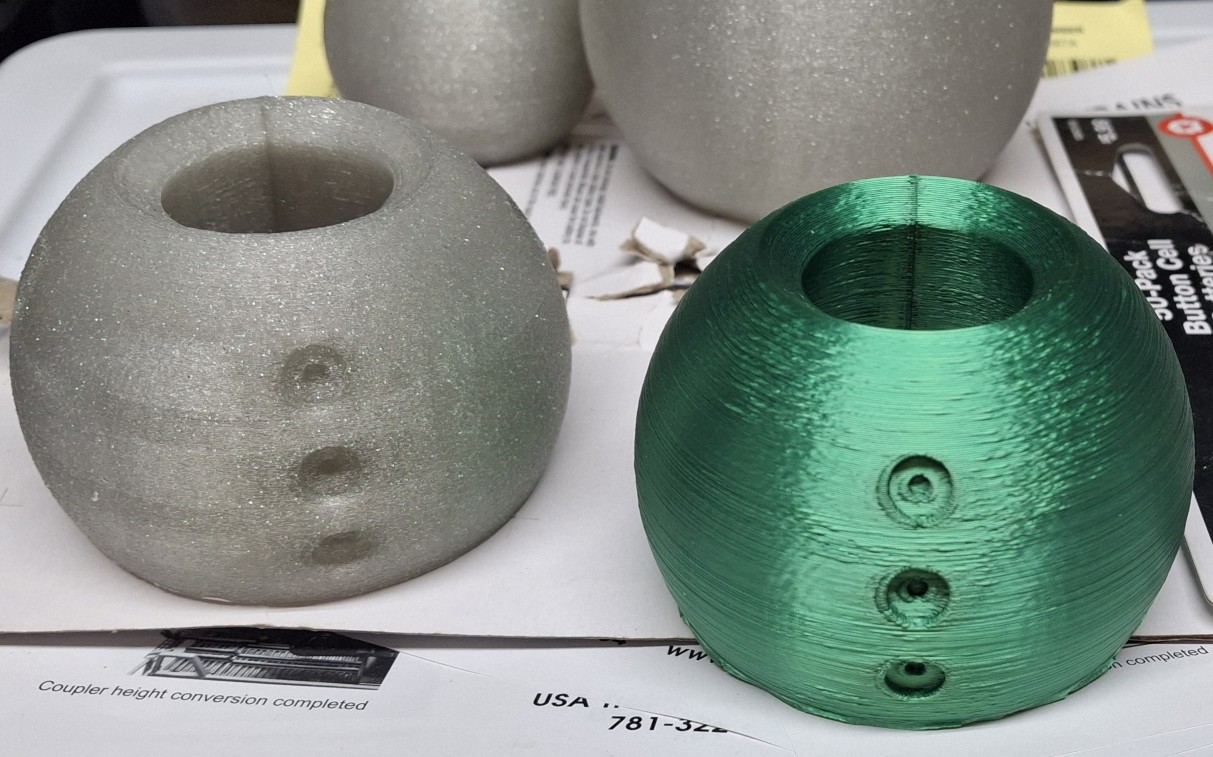 I printed two each, large and small, using the glitter silver, but they seem too dark. They’re waiting for future enhancements with fairy lights or LEDs or something like that. Once I realized the silk green would be shiny if I turned off the fuzzy skin in the slicer, I was amazed how much it looks like a Christmas tree ornament. That got me wondering how shiny the gold would look.