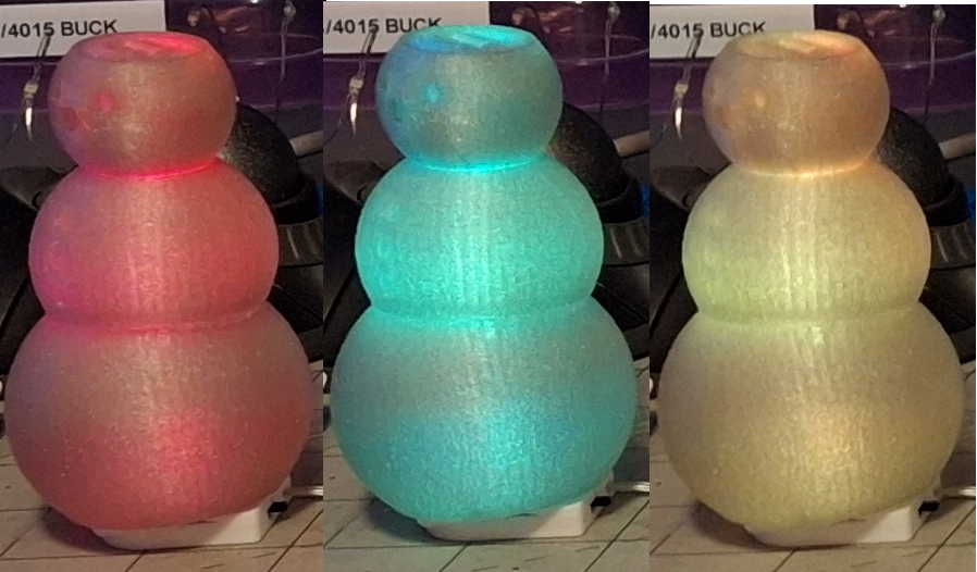 For now, I have six of those large translucent “Funfetti” snowman that are lithium battery powered. Four of them with the original colors and two more with the red and green Christmas colors. The four with original colors have been going for over a week now on the same cell and the same charge. I finally had to swap one out last night and charge it.