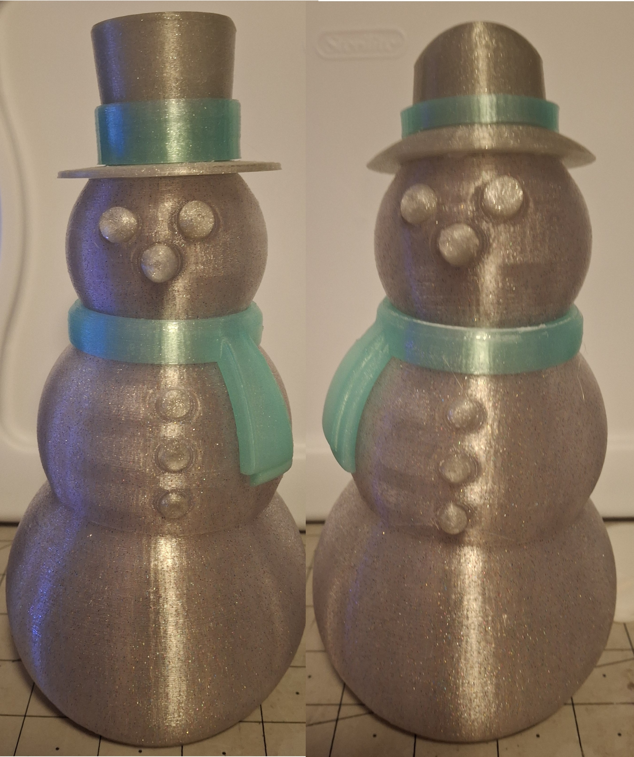 The printers sat idle for a day or so until I started printing more of the translucent filaments. The initial glitter silver ones seemed too dark. The funfetti ones seemed to be brighter and more colorful. I decided to print the buttons, eyes, noses, and hats out of the darker glitter silver and the scarves and hat bands out of the mint star stuff. Good choice!