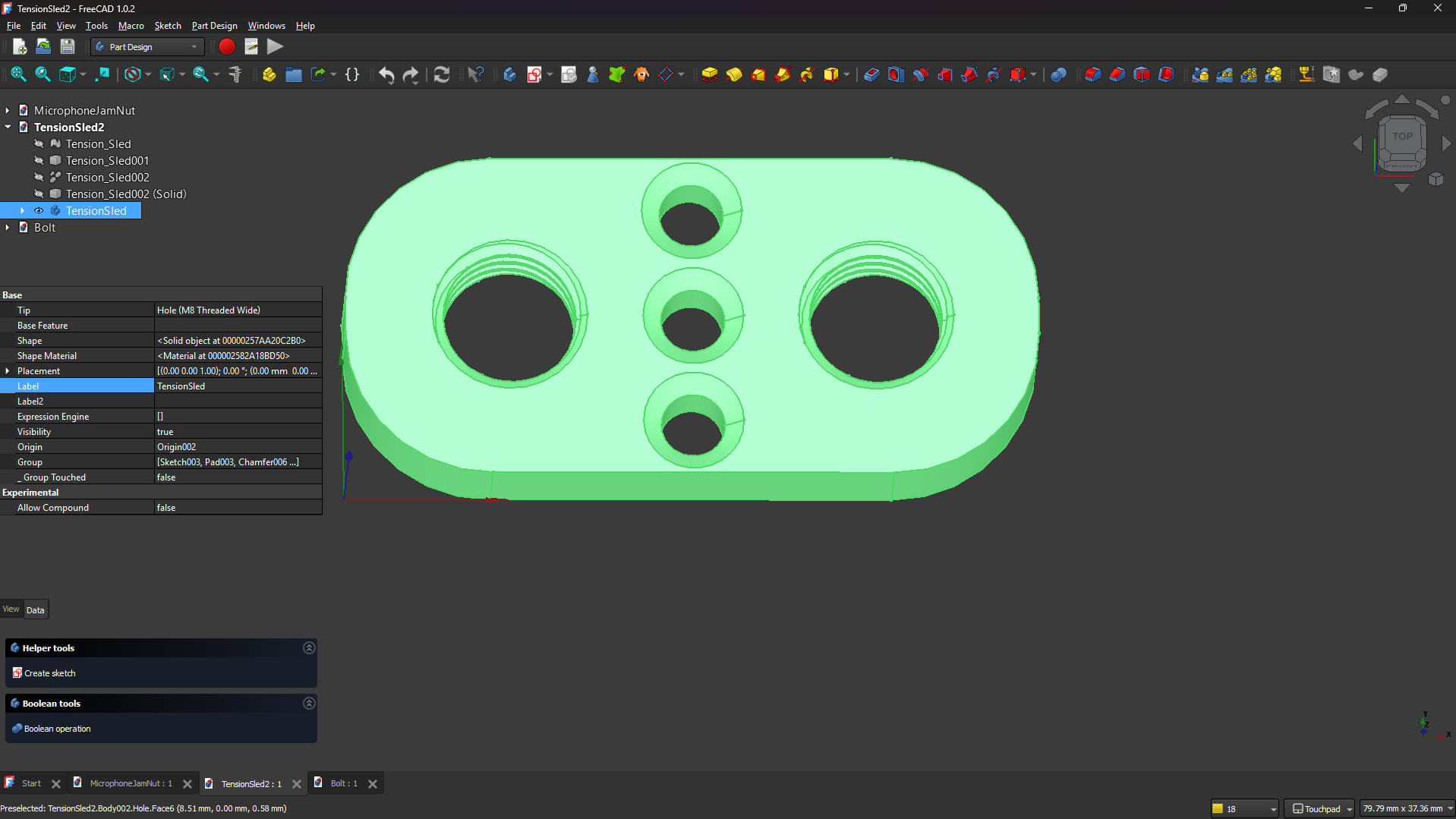 Child’s play so far, at least compared to drawing up my own tension sled and bolt designs. Like I said, major setback. Not to worry though, a little searching goes a long way with FreeCAD. Everyone’s asked the same questions I have already, and more than once. It’s the learning curve of a new application. But beyond that, it’s learning a new UI paradigm. This is uncharted territory.