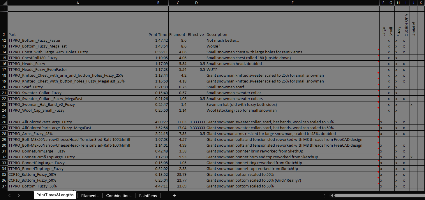 Hopefully I won’t bore you with all the little details here, but I think it’s safe to say an explanation of the process is in order. Worried I’d lose track of all the pieces parts printed and how much filament it took, I created a spreadsheet to track all the combinations and who they were bound for, with an included picture for each of the various combinations used. This helped me keep things straight.